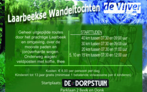 Jaarlijks organiseert buurtvereniging De Vijver in Beek en Donk de Laarbeekse wandeltochten. Ook dit jaar is dat het geval en wel in het weekend van zaterdag 16 en zondag 17 mei. Er worden twee wandeltochten uitgezet zodat er op zaterdag een andere route is uitgezet dan zondag. Er kan worden gekozen uit afstanden van 5, 10, 15, 20, 30 of 40 kilometer zodat er voor elke wandelaar wel een geschikte afstand tussen zit. De routes worden uitgepijld en gaan over B-wegen en onverharde paden in en rondom Laarbeek. Er kan per dag worden ingeschreven. Alle informatie is te vinden op de site laarbeeksewandel2daagse.nl.