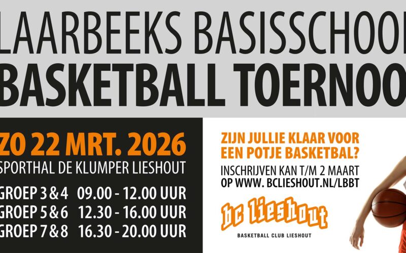 Voor leerlingen van de Laarbeekse basisscholen wordt zondag 22 maart het Laarbeeks Basisschool Basketball Toernooi gehouden. Het vindt plaats in sporthal De Klumper in Lieshout. De groepen 3 en 4 spelen van 09.00 tot 12.00 uur, groepen 5 en 6 van 12.30 tot 16.00 uur en groepen 7 en 8 van 16.30 tot 20.00 uur. Aanmelden kan tot en met 2 maart via bclieshout.nl/lbbt. De organisatie is in handen van Basketball Club Lieshout.