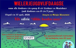 De Wielerjeugdvijfdaagse Lieshout-Mariahout vindt plaats van maandag 13 april tot en met vrijdag 17 april. Dit populaire evenement, dat al meer dan 50 jaar bestaat, is speciaal bedoeld voor alle kinderen van de basisschool tot en met groep 8 uit de dorpen Lieshout en Mariahout. De ritten worden verreden op een afgezet parcours in Lieshout. Kinderen strijden in verschillende categorieën op diverse voertuigen, variërend van driewielers en skelters voor de kleintjes tot mountainbikes en gewone fietsen voor de oudere jeugd. Voor de meest actuele updates over starttijden en de inschrijfprocedure op de officiële kanalen.