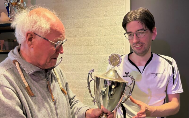 Bij Badminton Club Lieshout heeft Ruud van Vijfeijken na een enerverend toernooi de wisselbeker in ontvangst genomen. Hij mag zich ‘Clubkampioen Single 2026’ bij de heren senioren noemen. Na een eerdere verliespartij tegen Laurence Roijackers rekende hij uiteindelijk af met zijn broer Wouter die nog geen partij had verloren. Omdat het onderlinge resultaat bepalend was mocht Ruud alsnog de beker in ontvangst nemen. Dit jaar was er voor gekozen om geen plaatsingsronde te spelen. Alle deelnemers waren op basis van hun speelsterkte ingedeeld in poules. Hierdoor konden ze meteen beginnen aan de finalepartijen.