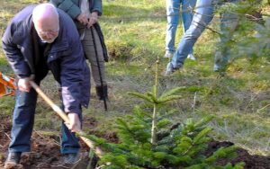 Bert is sinds jaren een gedreven lid van IVN Laarbeek en deskundig op het gebied van bomen. “In Stiphout was ooit een pinetum”, vertelt hij in zijn bij deze gebeurtenis horende toespraak. “Maar de bomen werden gekapt. Het was mijn wens om weer zo’n leerbos voor alle IVN’s in de omgeving terug te krijgen.” Bij de bomen komen kaartjes om informatie over de boom op te zoeken. Er worden zo’n twintig verschillende soorten naaldbomen geplant. Van elke soort drie. “Het wordt toch wel een mini-pinetum”, grapt Bert. “We planten niet de exotische soorten maar de naaldbomen die wij hier in Nederland gewend zijn.”