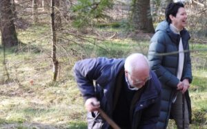 Met een ferme beweging van de hand, waaraan men jarenlange ervaring kan aflezen, werpt Bert Lemmens een volle schep zand in de kuil waar het nog jonge naaldboompje staat. Twintig belangstellenden zijn op deze stralende maandagochtend 23 maart verzameld om getuige te zijn van de aanplant van de eerste boom van het pinetum in het Mariahoutse bos aan de Veghelse Dijk. Een pinetum is een bos waarin een diversiteit aan naaldbomen staat. Onder de aanwezigen zijn wethouder Monica Slaets, leden van IVN Laarbeek, Laarbeeks Landschap en Bosgroep Zuid. Met de aanleg van een pinetum gaat een diepe wens van Bert in vervulling.